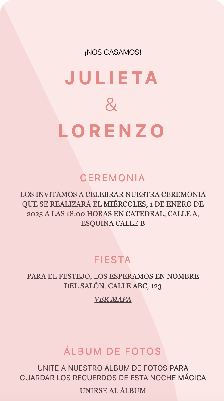 Elegí un diseño, agregá tu información y listo. Cada invitación es única y se ve perfecta en cualquier dispositivo.